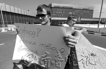 | 28日,斯诺登支持者站在机场前,海报上写着“爱德华,俄罗斯是你第二个家乡”。 东方IC供图 |