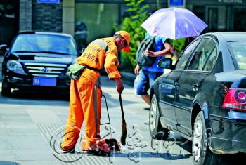 29日,济南白天最高气温达到34℃,在泉城路上,历下环卫工人依然坚守在工作岗位。 本报记者 王媛 摄