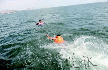 | 东顺海上救援队在烟大海水浴场上进行救人演练。 记者 李泊静 摄 |