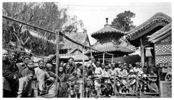乍看这张拍于上世纪四十年代的济南老照片,感到既熟悉又陌生。图中可见,老百姓中还夹杂着一些戴大盖帽的士兵,仔细看,其中还有一位洋夫人带着两个孩子。这是在哪里呢?这些人又是在看什么呢? 其实这就是当年的趵突泉一角,人们争相观看的,就是那趵突泉喷涌的泉水呀!不过,趵突泉那时大概不是三股水,而是六股水。原因是当时自来水公司在来鹤桥东侧泉池内制造了人工喷泉。因池底挖了两眼深井抽水,吕祖庙泺源堂前面池内三股水的势头大为减落,人工喷泉要比其高出许多。图中所示便是众人拥挤在泺源堂东侧来鹤桥石桥上以及北面望鹤亭茶社门前,争相观看这人工胜天之西洋镜的情景。 济南自来水公司趵突泉水厂于1936年底建成,当时供水范围十分有限,仅有1700多用户。不过此照拍摄于十年之后,图中这些兵并非韩复榘的兵,而是王耀武的兵。“四面八路三面匪,一城太太(司令)半城兵。”此时王耀武处境不妙,济南府已是孤城独悬,四乡周边都是解放区了。 你不难发现,图片中央王耀武那些兵的身后稍远处,那座圆顶重檐亭子又是个什么物件呢?此即昔日之御碑亭。原御碑亭重檐圆顶为黄色琉璃瓦覆盖,周围有二尺高的栏杆护持,在吕祖庙红墙相映衬之下,显得光耀夺目,小巧玲珑,华丽异常。御碑亭内立着块双御碑:正面为康熙大字榜书“激湍”二字,背面是乾隆所书《再题趵突泉》诗文。时隔不久济南解放,锣鼓声中改天换地。供奉封建帝王诗文墨迹的御碑亭在整修趵突泉时拆除,双御碑石则在文革中被砸毁。惜乎御碑石料坚硬,红卫兵小将“金猴奋起千钧棒”,却只是砸成了两半。用水泥接起来的御碑,现立于泺源堂后面娥英祠院中。 清末民初以来,济南府西关趵突泉即为江湖艺人跑码头必至之地。京津相声艺人闯济南府,第一个到来的是“万人迷”。“万人迷”本名李德鍚,京城“相声八德”之一。“万人迷”来济南约在1920年前后,首次登台献艺就是在趵突泉望鹤亭茶社。此人相貌古怪,高身阔脸,大眼高鼻,嘴唇外撅。擅长单口相声,口才极佳,不仅会的节目多,而且极善当场抓哏,观众们被逗得前仰后合,他却面孔呆板,若无其事,故享有“冷面滑稽”之口碑。张宗昌早在天津时就听过“万人迷”的相声。1925年到济南后听说“万人迷”正在趵突泉卖艺,忙派人将其邀至督署演堂会。几段演罢张宗昌大喜,竟将打麻将刚赢的一千块大洋全部赏给了“万人迷”。 不过“万人迷”挣的毕竟是小钱。张宗昌则在趵突泉身上捞了一大笔。 当时老张在吕祖庙泉池对面及东西两面都建起二层楼房,摊派给一些大商号购买。趵突泉原庙堂式南门拆除,在洋楼底层中部开了三个拱形大门,中间拱门上方雕有“趵突泉”三个大字。韩复榘主鲁之后把张宗昌所搞房地产业统统拆除,将趵突泉隔为南北两院,在南院筹建济南自来水公司;重建劝业场并改称为国货商场。于是国货商场与趵突泉同时成为两块曲艺胜地。 趵突泉泺源堂前的望鹤亭、观澜亭等茶社有女鼓书艺人在那里演唱梨花大鼓。梨花大鼓“四大玉”谢、赵、孙、李,鼓界皇后鹿巧玲等人都曾在此登台献艺。趵突泉边女伶夜夜唱梨花盛极一时。四大玉中的李大玉家住南新街北口路东,其夫李泰祥的“泰祥书场”就在街口路西国货商场内。名艺人刘泰清在泰祥书场唱西河大鼓十分叫座。后成山东快书名家的高元钧,1934年从河南流浪至济南,一早一晚就在泰祥书场“抢板凳头”(垫场)说武老二,白天则在国货商场空场子中与济南相声艺人崔金霖、吴景春、吴焕文、刘剑秋等人合说相声。老舍当时住南新街中胡同,不但去趵突泉听过女艺人唱梨花大鼓,也曾听过高元钧的武老二,并曾与吴氏兄弟交朋友讨教相声段子。 当时趵突泉内还有个济南艺人书词联合会,那时省民众教育馆也举办书词训练班。田连元父亲田庆瑞就是1933年从词训练班毕业的,上世纪50年代田连元在人民商场土坡上“立武书场”给演唱西河大鼓的张立武当琴师弹三弦,又自立门户改说评书。后来锦州曲艺团来济南招聘,田连元应聘去了东北。 文革前济南有五大书场确乎是曲山艺海震江湖。如今走过泺源大街,昔日国货商场只剩下路南一个门牌。不过趵突泉泺源堂仍有票友与专业曲艺演出活动,也算是昔日曲山艺海余波未息吧。