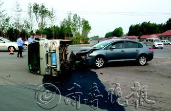 本报7月2日讯(记者 李晓东)2日早上7点半左右,在乐川街与潍州路路口处,一辆蓝灰色轿车与一辆小型面包车相撞,蓝灰色轿车前部受损严重,小型面包车受撞击侧翻。据了解,当时小型面包车车主正送自己孩子和邻居家的小孩上学。记者从医院了解到,事故造成两车司机及面包车上的三名儿童受轻伤。