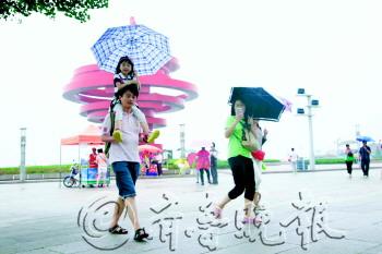2日下午,降雨为五四广场的游人送去清凉。当日,市区高温接近30℃,天气闷热,下午的短时雨水为岛城送来了短暂清凉。