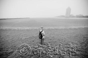 2日,一名游客在二浴望“浒”兴叹。当日,受西南风影响,二浴遭到浒苔“围攻”,浒苔厚度达到了五十多厘米,远远望去,海面如同一片草原。