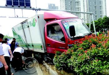 | 厢式货车开进了路中央绿化带,120急救人员正在救治伤者。(图片由市民潘先生提供) |