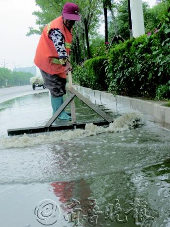 | 2日上午,一名环卫工人清除渤海十一路的积水。 本报记者 张卫建 摄 |  | ◤张肖堂干渠渤海九路段部分河道出现淤积、河床上抬现象。 本报记者 张卫建 摄 |