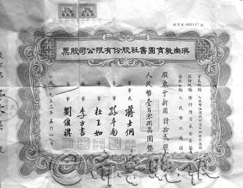 | 于世显珍藏的济南教育图书社的股票 |  | 成山书店股董唐述尧与谷牧的合影 |
