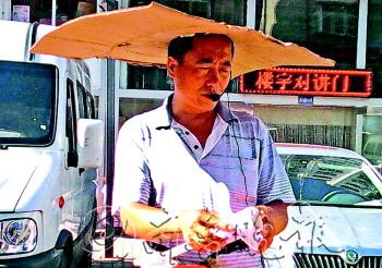 自述:摊主用纸箱板做的遮阳帽。