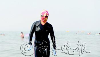 | 3日,在第一海水浴场,一市民游泳的同时不忘做好防晒。 记者 李泊静 摄 |
