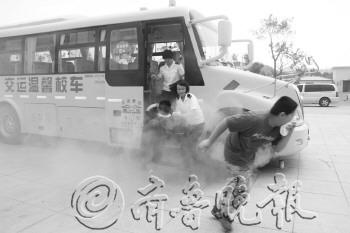 3日上午,在崂山张村河小学温馨校车停车场,一辆校车冒起“浓烟”,学生们在交运温馨校车护导员的指引下,顺利从“起火”的校车上逃生。