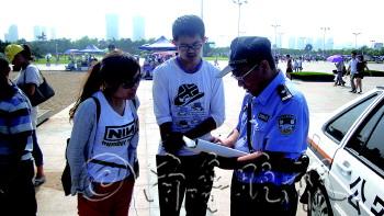 | 6月29日,民警向小赵(中)了解情况。 |  | 6月29日,民警正在沙滩上寻找小赵丢失的钱包。(警方提供) |