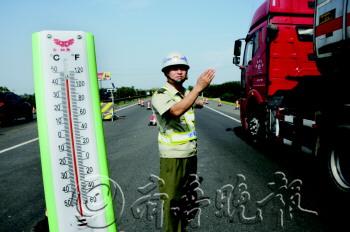 3日下午3时许,济青高速淄博段实测空气温度45℃,路政人员坚守在高速公路上,疏导交通,救援清障。当日,淄博城区最高气温出现在临淄区,达到38.5℃,市气象局发布今年首个高温橙色预警信号。据天气预报显示,3日晚间到4日白天,淄博阴有雷阵雨转中雨,气温24—31℃,将为市民带来一份清凉。