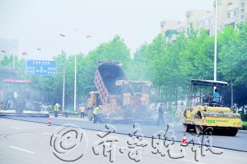 | 8日上午,济南路一路段正摊铺沥青。本报记者 刘涛 摄 |