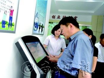 | 在牡丹区大学生创业服务中心,设有触摸屏,上面有申请入驻孵化基地的手续说明和大学生创业小额担保贷款、创业补助等各种优惠政策。本报记者 李凤仪 摄 |