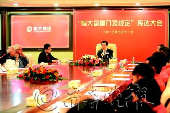 | 许家印亲自主持《恒大国脚八项规定》传达大会。 |  | 《恒大国脚八项规定》文件 |