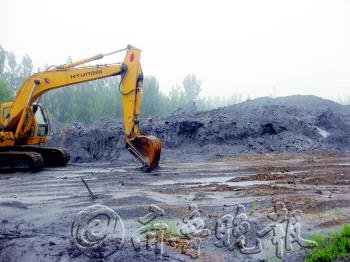 | ◥14日,李恩顺望着成堆的粉煤灰和建筑垃圾很是无奈。 |  | ◤这台挖掘机已经20多天没作业了。 |