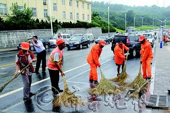 本报7月14日讯(记者 孙芳芳 通讯员 李春庆 毕英华) 14日,持续五天的大雨暂停。大雨把一些山体、建筑工地上的泥沙裹挟着沉积到路面上,趁着大雨暂停,环卫工人们开始忙活着清洗道路。 上午9点,烟台市城管局环卫处的工作人员在北马路、青年南路、白石路、迎祥路检查环境卫生,同时冲洗道路上的淤泥。 在淤泥较为严重的迎祥路、红旗路西段,烟台市政养护工人和环卫工人并肩合作,市政工人忙活着向运输车上装运淤积的泥沙,环卫工人协助清扫地面,同时用水冲洗泥渍。芝罘区环卫处的高压水车缓缓前行,6名环卫工人分成两组,一组手持水管冲洗道路,另一组工人则挥动大扫把快速清扫。 负责检查市区环境卫生的烟台市环卫处监察大队邹辉大队长告诉记者,持续降雨对环境卫生造成了不小的影响,垃圾大量被雨水浸泡,增加了运输和处理的难度,延长了作业时间。同时,道路上的淤泥、流黄也需要及时清理。 据统计,连日来,环卫部门和市政养管部门密切配合,至14日下午,六区环卫部门共出动600多人次,清刷道路80余万平方米,清理泥沙200多立方米,市区主次干道被流黄污染的路面基本恢复正常。