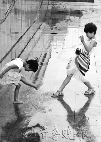 14日,雨后两个孩子在中心广场一角的积水处嬉戏。据天气预报,未来四天降雨天气仍将持续。 本报记者 王小会 摄