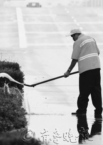 11日下午,在康博大道上,一环卫工人将快车道边的积水清入绿化带,防止车辆通行时溅起水花。 本报记者 马志勇 摄