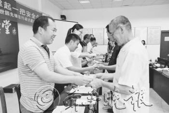 14日,在永安路街道办,志愿者代表接过安全巡逻袖标。该街道在10个社区内招募了300名志愿者担当孩子暑期安全督导员,每位督导员负担10—15名孩子的安全督导,建立安全督导日记,为孩子们“保驾护航”。
