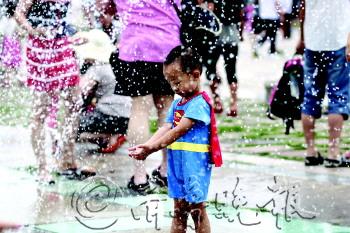 | 14日,天气闷热,一名小朋友在五四广场喷泉里玩耍。 本报见习记者 杨广帅 摄 |