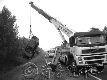 | 出事的轿车被道路清障车吊出。(图片由路政部门提供) |