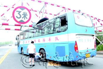 14日上午,滨州黄河大桥上一限高杆卡住了一辆从这里经过的旅游大巴车,从车头到中部全部被挤压,车顶棚已经严重塌陷变形,所幸没有造成人员伤亡。图为旅游大巴车司机正在给轮胎放气。 本报记者 张牟幸子 摄