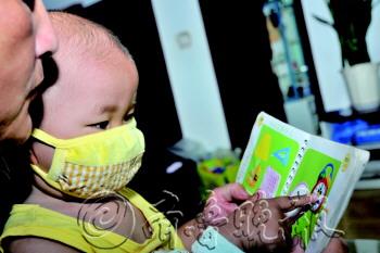 ▲由于年龄比较小,飞飞得在奶奶帮助下才可以看书。 本报记者 王鸿哲 摄