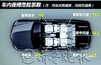 后排乘客也要系安全带 是不是坐在后排座位上,危险性一定比前排低一些呢?其实不然。在严重车祸中,如果都不系安全带,后排乘客受伤和死亡的概率并不比前排低多少。在接近50公里的时速下发生前方撞击,一个位于汽车后座的正常成人,向前抛射的力量可以高达3吨半。这时候,若没有后座安全带的固定,极可能造成后座乘客本人以及其前方的前座乘客发生危险。 另外,孕妇坐车应当佩戴三点式安全带,腰部安全带应当尽量系低一点,以保护胎儿。 后排中间是最安全的黄金座位 汽车行驶,安全当数最值得留心的问题。虽然车内座位有限,但在安全方面也有好坏之分,如果有条件,尽可能地寻找最安全的座位,也为自己在行驶过程中多撑了一把“防护伞”。 美国交通管理部门曾经有一个专家小组,专门对小汽车座位的安全问题进行了调查研究。最后得出结论:车内最安全的座位是后排中间位置,而最危险的座位则是副驾驶座位。如果要用数据表现结果,若将汽车驾驶员座位的危险系数设定为100,那么,副驾驶座位的系数是101,而驾驶员后排座位的危险系数是73.4,后排另一侧座位的危险系数为74.2,后排中间座位的危险系数为62.2。 于是,大家便可以通过车内各座位安全性大小排列顺序来选择座位,后排中间的“黄金座位”最安全,但是一定要系好安全带。 当“黄金座位”被占据时,不妨选择驾驶员后面的座位,因为当事故发生时,驾驶员的本能反应肯定是保护自己,所以坐在同一方向其实是更加安全的。 而一般情况下,重要人士的车内固定座位是副驾驶的后排位置,也是让客人坐的最礼貌的位置,虽然不是最安全的座位,但是相较于前排安全系数也并不低。 副驾驶座和驾驶员的位置算是最不安全的座位了,虽然有安全气囊的保护,但只有系好安全带才能充分发挥气囊的作用。 据《北京晨报》