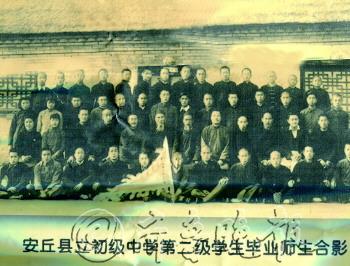 | ◤安丘一中县立中学时期学校大门 |  | ▲安丘县立初级中学第二级学生毕业师生合影 |
