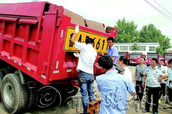 | 17日上午,在槐荫区渣土车年度复核现场,工作人员对复核合格的车辆安装放大的反光车号牌。 通讯员 任亮 摄 |