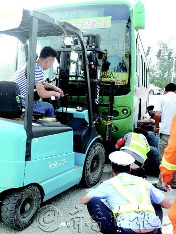 | 女子被卷入公交车底,救援人员找来起重气垫和叉车救人。 消防供图 |  | |
