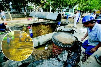 | 事发南京路53中门前,疑因管道老化及重型车辆碾压所致 | |