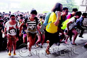 18日8点30分,省图大门刚开,雨中等待多时的人们蜂拥而入。本报记者 王鸿光 摄