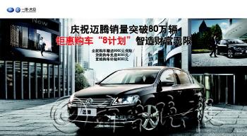 作为原汁原味的德系汽车,全新迈腾不仅具备大众B级车的纯正血统,在生产过程中也严格遵循了德系车严谨、理性的高标准造车理念,是一款按照C级车生产制造标准打造的B级车。 首先,全新的十大静音技术让全新迈腾拥有了更高的全新“静”界。十大静音技术包括:带吸音膜的前风挡玻璃、加强的发动机舱隔音垫、仪表盘吸音棉、手套箱吸音棉、加强的行李箱吸音垫、加厚的后门玻璃及后三角风窗玻璃、能有效消除后轴传给车身振动的柔性后轴、车门无缝三层密封条、低风噪车身外形设计、底盘防护。 其次,诸多豪华配备将全新迈腾的舒适性能推向顶峰。全新迈腾采用无钥匙进入,一键启动智能系统(Kessy)。两种模式的一键开启式点火系统大大方便了车主的驾驶操作。 在车内温度调节上,全新迈腾采用前后控制双区智能空调。温度、空气分流和鼓风强度均可通过音响系统显示器显示。全新迈腾装备的天窗系统采用双模式十挡位开启,同时具备防夹、防紫外线、防静电及抗污功能。 在座椅上,全新迈腾拥有前排带记忆功能豪华座椅和豪华可折叠后排座椅,集电动调节、座椅加热等诸多功能于一身。 全新迈腾拥有强大的娱乐系统。其中,旗舰车型的车载影院系统配备7寸真彩色液晶触摸显示屏,后排娱乐系统支持左右屏单独观看模式,并支持模拟、数字电视和外接音频、视频的输入。 作为大众汽车品牌B级车的第七代产品,无论是表面还是内在,无论是整体还是细节,全新迈腾都继承了德国大众优秀的产品基因,追求品质的完美,将B级车的行业标准推向了更高水平。 为庆祝一汽-大众迈腾销量突破80万辆,一汽-大众现启动“钜惠购车‘8计划’智造财富无限”感恩回馈活动,以最优惠的价格,最完美的服务回馈一贯支持一汽-大众汽车的消费者,届时,莅临展厅,更有精美礼品相送,敬请把握,具体优惠如下: 1、标准信贷首付最低20%,1年0利率,1年以上低利率;2、弹性信贷首付50%,一年后结清50%尾款,月供仅需288-688元;3、信用卡分期,悦享建行18期0利息、0手续费,36期0利息、低手续费;4、任意品牌二手车置换迈腾,尊享8000元补贴;5、全款购买迈腾全系,赠送价值8000元的三大主险:交强险、车损、三者30万、车上人员2万/座、盗抢、以上险种不计免赔。
