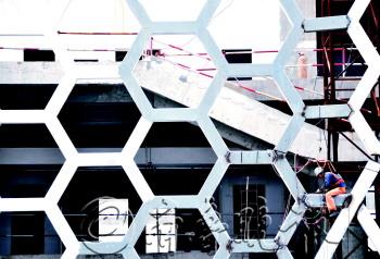 本报记者 汪泷 摄 |  | 工人正在奥体中心游泳馆进行外墙焊接。