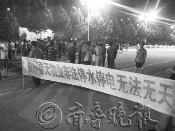 本报热线6610123消息(记者 侯艳艳 王永军) 因对物业服务不满,17日晚,柏林春天约300名居民聚集到青年南路,通过打横幅、堵路的方式进行抗议,青年南路交通瘫痪数小时。 “前面过不去了,请掉头行驶。”17日晚8点多,记者沿着青年南路南行到离柏林春天小区北面约200米的位置,两位民警就在路口疏导交通。记者走到柏林春天小区发现,不少居民堵在路上,把青年南路整个堵了起来,车道上围满了居民。在南向车道上,还有几位市民拉起了横幅。 记者粗略一数,现场约有300人,其中还有不少抱着小孩的居民。有几位居民拿着小马扎坐在路上,把路封堵起来。在人群最集中的位置,居民围着两名民警,情绪都显得很激动,话语间都是对小区物业的不满。 一位小区居民告诉记者,“这次堵路是居民间相互约好的。”不少小区居民对物业的服务不满意,因而拖欠物业费,最近居民家中多次出现停水停电是堵路的导火索。在采访中,不少小区居民告诉记者,堵路的行为确实影响了附近车辆通行,但他们想通过这种行动说明自己的立场。 截至21点20分记者离开现场时,大部分人群依然没有散去。记者从一位居民处得知,晚上10点多,一对中年夫妻被民警带走。大约到夜里12点左右,聚集的居民才离开。 据了解,柏林春天小区居民和物业间的问题由来已久。2012年8月,因小区停车问题,小区居民和物业发生冲突。随后,居民和物业间进行了协调。 深度调查 家中停水又停电,居民称是物业所为 18日上午,记者来到柏林春天小区。提起17日晚上“集会堵路”的举动,部分居民表示不知情,还有几位居民则表示是无奈之举。“大家举报过,问题得不到解决,只有这样才能引起重视。”一位居民说。 “欺人太甚了,夏天停水断电,让我们怎么生活?”小区一期56号居民王先生把记者领到家中,只见卫生间和厨房里放着七八个大大小小装满水的水盆。王先生说,这些水都是从邻居家借来的,每天晚上他和妻子都去借水,已经持续了一个多月。 好端端的为何不供水了?王先生指着门外的供水管道说,6月一天早晨,他突然发现家中停水,出门一看,供水管竟被人拆除了一截。王先生说,供水管外有个上锁的门,只有物业公司有钥匙。更令王先生气愤的是,3天前起,家中无端地出现停电跳闸,有时一天家中停电三四次。王先生怀疑有人对自家用电做了手脚,才出现这种不正常现象。 记者了解到,王先生家的情况并非个例,在柏林春天一期的56、62、63号等几栋楼中,这种断水、停电的现象较为集中,这些业主均没有交物业费。 物业: 不会断水停电 将起诉“闹事者” 不满物业服务,没交物业费的不少 “我家厕所反映了多少次,也没修好。”18日下午,一位业主来到柏林春天物业公司,气冲冲地喊道。当物业服务人员询问他有没有交物业费时,这位业主说:“对物业服务不满意,凭什么交物业费?”记者采访了解到,在这个小区不少业主没有交物业费。 “我们楼道单元门坏了,反映了多次也没有维修。”“我们楼居民坐电梯时电梯突然从7楼坠落到3楼,吓得要命。”几位居民议论纷纷,“不是我们不想交物业费,居民反映的问题一定要及时解决。” 令许多居民不解的还有物业公司变更的问题。56号楼业主李先生给记者提供一份《前期物业服务协议》,落款处盖着烟台海港物业管理有限公司的印章,签订时间为2010年6月21日。但有些业主透露,小区物业公司早在2012年年初就变为一家新的物业公司。居民反映,新的钜深物业公司是2011年刚成立的,2012年并没有在物价部门报备,那时手续并没有办全。对此居民存在很多的疑问,且没有收到合理答复。 柏林春天钜深物业公司黄经理说,16日,小区一位居民纠集30多名居民在物业公司门前堵门,“这位居民去年曾因推倒小区岗亭,使物业公司损失1万多元,无奈之下,我们才对他断水断电。”但从没对其他居民停水停电。有些居民家的线路可能出现故障,找供电公司修就可以。 黄经理说,这位居民17日下午纠集小区居民,18日上午,民警将那位带头的居民带走调查。“我们将依法处理闹事者,保护企业的合法权益。” 对于居民反映的物业公司变更问题,黄经理解释,今年1月18日,烟台利嘉置业有限公司已解除与海港物业管理有限公司签订的协议,重新与钜深物业公司签订协议,规定从2013年1月11日起至2016年1月10日合同生效。而且钜深物业公司具有物业服务资质,收取居民物业费的行为完全合理合法。 本报记者 侯艳艳 实习生 周矗 程诚