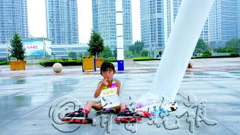 | 18日,由于找不到相应设施,滨海广场一位小女孩席地而坐吃盒饭。 见习记者 张倩倩 摄 |