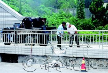 因近期降雨较多,18日在北园铁道桥下,施工人员正在为非机动车道开挖排水口,提升排水效率。