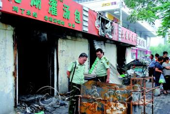 图为:18日上午消防人员正在勘查火灾现场。本报记者 崔如坤 摄