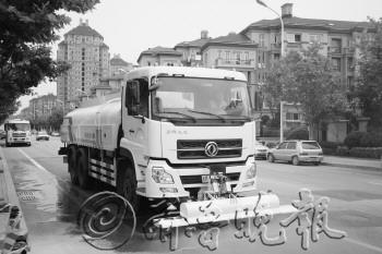 18日,在宜川路,一辆高压冲洗车正在清扫路面。为迎办世园会,李沧区投入360余万元购置6辆高压冲洗车清洗路面。与一般冲洗车相比,该车压力大、动力足,辐射面积大,能有效去除路面积存的建筑渣土和淤泥。
