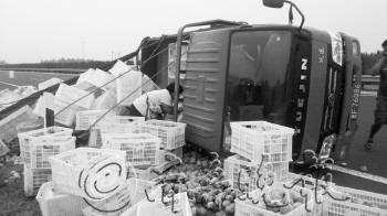 | 货车侧翻后,桃子散落一地。 (图片由警方提供) |