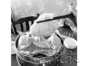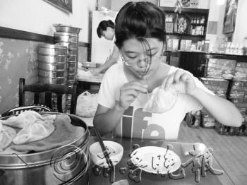 | 店内一位顾客正用吸管品尝包子。 |  | 刘师傅羊肉灌汤包,透明包子皮内的汤馅清晰可见。 |  | 老板娘向记者演示刘师傅羊肉灌汤包的制作过程。 |