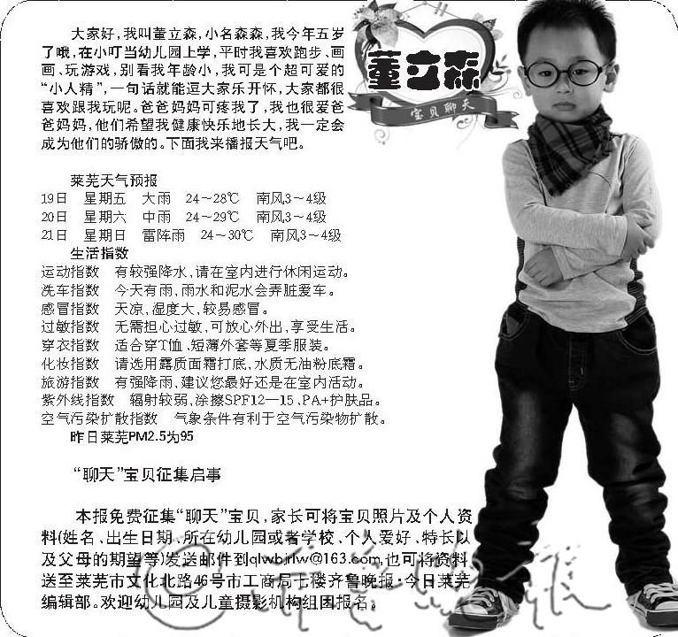 本报免费征集“聊天”宝贝,家长可将宝贝照片及个人资料(姓名、出生日期、所在幼儿园或者学校、个人爱好、特长以及父母的期望等)发送邮件到qlwbjrlw@163.com,也可将资料送至莱芜市文化北路46号市工商局七楼齐鲁晚报·今日莱芜编辑部。欢迎幼儿园及儿童摄影机构组团报名。