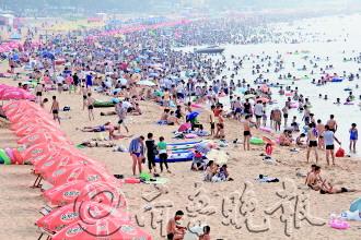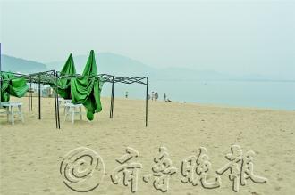 | ▲工作日又逢天气阴沉,葡萄滩海水浴场上游客稀少,休息棚都被收了起来。 |  | ▲海水浴场人气火爆。 记者 王震 摄(资料片) |