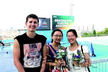 女子三米板的颁奖仪式后,吴敏霞和施廷懋频频向看台挥手致意,看台上的两个中国姑娘又蹦又跳,仿佛自己也拿了金牌一般。颁奖仪式结束后,吴敏霞和施廷懋有意识地把手中的鲜花抛给了两个中国姑娘。难道这两个姑娘是吴敏霞和施廷懋的亲戚或者朋友?一打听,才知道这两个姑娘是吴敏霞的忠实粉丝。 有些人的一些疯狂举动是不被理解的,就像吴敏霞的粉丝解姑娘。解姑娘是四川人,如今在美国加州读书,为了看吴敏霞的比赛,她直接从美国飞到了巴塞罗那,就想在现场为吴敏霞加油助威。与她同行的还有一个四川人秦姑娘,现在正在巴塞罗那选修西班牙语。 解姑娘说:“我小时候练游泳的,一直迷恋郭晶晶和吴敏霞,迷恋跳水。现在郭姐姐退役了,霞姐的比赛是看一场少一场,所以我就狠狠心来了。”对体育明星没那么疯狂的秦姑娘指着小解说:“她对体育太疯狂了,前几天还缠着我去巴萨看内马尔的见面会呢!” 说起吴敏霞要退役的话题,小解有些失落:“我希望霞姐不要退,看你跳水还没看够呢,你要为我们粉丝再跳下去。”小解说:“如果有可能的话,我希望她能坚持到巴西奥运会,她有这样的实力。”
