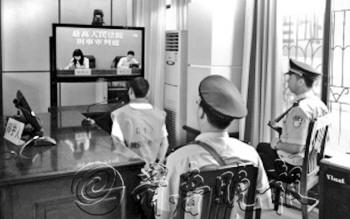 | 2011年6月8日,抢劫致人死亡的被告人梁志华,在两名法警的羁押下来到融安县法院远程提讯室。远在北京的最高法院刑事审判庭法官,通过视频专网对梁完成了死刑复核远程提讯。(资料片) |