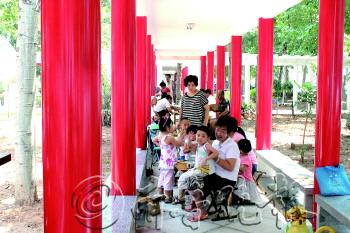| 小区自治后,居民气顺了,图为小区居民正在新建凉亭内聚餐。 |  | 业主在小区健身设施处活动。 |