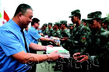 本报7月21日讯(记者 钟建军 通讯员 洪波 志娟 辉东 报道) 为深入推进“五进两服务”大走访活动,增强官兵的法律意识,解决官兵的涉法问题,19日上午,海阳市人民检察院组织干警到济南军区某摩步旅开展了“送法进军营”走访慰问活动。 30多名检察官来到济南军区某摩步旅野外驻训点,向驻训官兵赠送了常用法律书籍、时令蔬菜、水果和肉食品。紧接着,4名经验丰富的检察官结合多年的工作经历为官兵讲述了一堂生动的法制教育课,帮助官兵增强了法纪弦,引导官兵争做守法好士兵,检察官的精彩普法内容赢得了官兵们的阵阵掌声。