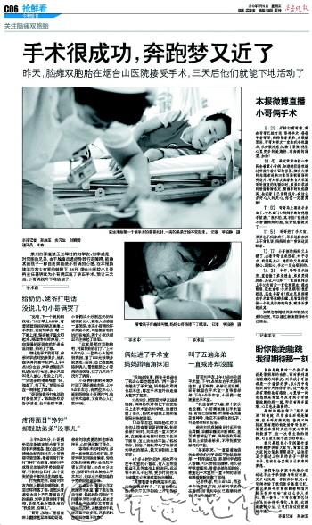 本报7月21日讯(记者 孙淑玉 实习生 刘卿卿) 莱州市驿道镇玉兰埠村的刘学友、刘学成是对双胞胎兄弟,由于脑瘫后遗症小哥俩一直存在行走障碍,自由奔跑是小哥俩长久的心愿。(本报5月30日C12-13版报道)。18日上午,小哥俩相继走进手术室并顺利完成手术。小哥俩的病情牵动这诸多好心人的心,周末不断有市民前来看望他们。记者从医院了解到,目前,哥哥恢复情况不错,弟弟术后疼痛已过,俩人均可正常进食并能起身活动,预计22日便可下床行走。 18日晚,哥哥刘学友能吃些稀饭,时常默默看着临床喊疼的弟弟,给他加油鼓劲。19日中午,术后恢复情况较好的哥哥已能正常进食。相比哥哥,20日,弟弟刘学成因病情较重,术后时醒时睡,清醒时也多在哭着喊疼。“你骗我,做手术可疼了。”清醒时弟弟刘学成会对妈妈抱怨,只有想到以后能和哥哥一样跑跳才会不多言。 21日,记者再次来到医院,小哥俩明显精神很多,术后疼痛已过,俩人进食没问题,精神好的时候还能做起来稍微活动下。记者从医院获悉,预计小哥俩22日便可下地活动。 小哥俩的情况牵动着很多读者的心,本报公益群内网友“深海的鱼”19日一早就赶到医院给兄弟俩打气。得知小哥俩的情况后,19日,本报小报童李溦伊给小哥俩送去了600元压岁钱,祝福小哥俩早日康复。此外,扬帆助学服务队的义工也在陆续给小哥俩捐款。 手术前一天,本报公益群的热心网友王燕下班后匆忙赶去探望,18日小哥俩刚出手术室,王燕又赶去帮忙照顾。19日下午,担心小哥俩的恢复情况,王燕再次赶到医院帮忙照料。 目前本报已先后为小哥俩筹集3万余元善款,这部分善款基本能满足小哥俩的手术费用,但后期康复治疗的近4万元费用仍没着落。如果您愿意帮帮这对可爱的双胞胎兄弟,请赶紧和我们联系:15264520357。如您愿意直接助力俩孩子完成手术,可直接汇款到孩子的账户:刘学成,中国邮政储蓄银行账号6212854560000591649。 本报7月19日报道的版面 “等你俩康复后,姐姐带你们踢足球” 7月19日是双胞胎兄弟刘学成,刘学友做完手术的第一天,热心大学生迟晓雯来医院看望孩子,给孩子带来一箱牛奶。她偶然登录妈妈的QQ看到了公益群里小哥俩的消息,特别想为哥俩做点儿什么,献份爱心。 迟晓雯守在哥哥刘学友的床前,她知道学友爱玩游戏,掏出手机给他玩。学友玩得不亦乐乎,时不时的向姐姐讨教通关的诀窍,全然忘记了身体的不适。 弟弟刘学成术后精神不佳,一直喊疼哭了好几次。迟晓雯看到孩子难受的样子,想起了自己住院的情形,她安慰孩子:“男子汉要勇敢,等你康复后,姐姐带你去踢足球。”眼里含着泪花的刘学成使劲点了点头,冲着迟晓雯笑了。 本报记者 孙淑玉