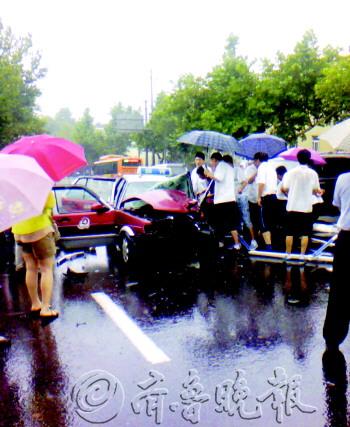 本报7月21日讯(记者 周衍鹏) 21日中午,在人民路与宁岗路交口处,一辆越野车突然失控,冲破路中央护栏后,又撞向对面车道上的出租车,出租车上5人全部受伤住院。据目击者称,事发后不久,肇事车上两名男子便迅速离开现场,不知去向。目前,警方已介入调查。 “一辆越野车把出租车给撞了,伤了好几个人!”21日11时20分许,市民向本报热线反映称,事发人民路与宁岗路交口处,出租车司机及一名乘客受伤较重,一度被卡车内出不来。民警及消防官兵正在现场进行救援,120救护车也在一旁等候。 记者闻讯赶到现场时,伤者已经被送往附近医院救治。人民路上有大半路面被封锁,一辆红色出租车车头朝北停在由南向北方向的内侧车道,车身左后侧严重凹陷,边框受挤压向四周绽开,露出不规则铁皮,车窗玻璃完全碎裂,散满一地。马路正中的护栏被从中撞断十余节,近20米长,民警正紧张地清理现场。记者在现场并未看到肇事的越野车,经了解得知,肇事车已被拖车拖走。 事发时,正在路边烧烤的李先生几乎目睹了车祸的整个经过。据他介绍,当时这辆黑色越野车正沿人民路由北向南行驶,“刚过了路口,车速挺快,不知道怎么回事突然就撞到护栏上去了。”此时,由南向北方向车道上刚好驶来一辆出租车,结果被冲破护栏的越野车撞了个正着。 “出租车上连司机在内有5个人,全部受伤了,有两个被卡住的还是被消防队员救出的。”李先生称,虽然事发时正大雨倾盆,但仍有好心路人赶紧上前施救,费了很大劲终于将变形的车门拉开,将受伤较轻的3人从车上扶了出来。 记者随后赶到市中心医院,在急诊室见到了受伤严重的出租车驾驶员,事发时,他被方向盘与座位牢牢卡住,造成胸部肋骨骨折。据司机回忆,车被撞后,他还下意识地踩了刹车,拉了手刹。据了解,车祸中受伤的另外四名乘客年龄均在20多岁,上午刚从医院探望完住院亲人准备回家,结果半路碰上横祸,目前也均已住院接受治疗。 据目击者称,肇事越野车车上当时车上有两名男子,事故中头部也受了伤,但未等交警到现场进行处理,便匆匆弃车离开,不知去向,事故原因暂时无从知晓。目前,警方已介入调查。